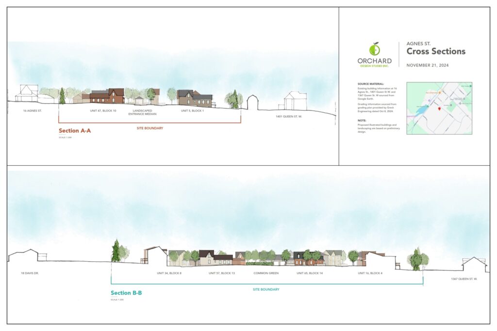 Agnes Street frontage. End units of Blocks 1 and 10 face Agnes St. to be consistent with existing homes across the street. Priority lot design, bungalow or 1½ storey.